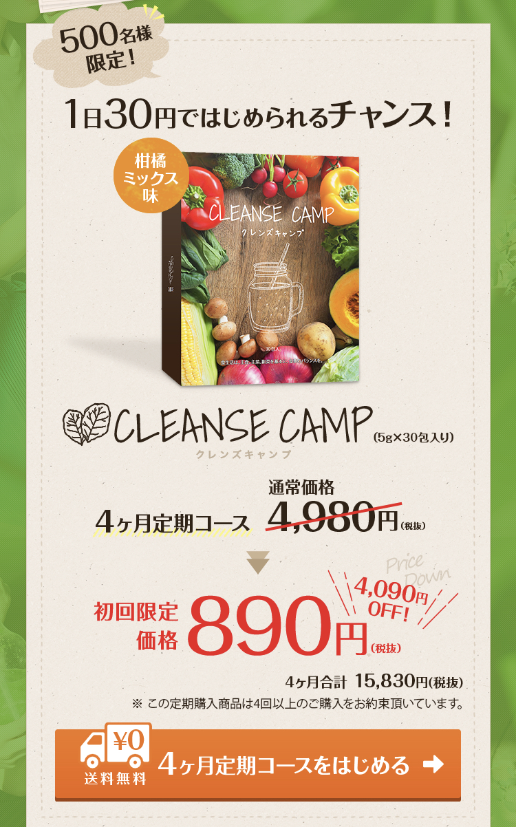 雑誌やメディアで取り上げられて今話題沸騰中の大人気【クレンズキャンプ】がWEB限定でキャンペーンを実施中! 今なら公式サイトからお申込みいただくとお得な特典が盛り沢山!キャンペーンは公式WEBサイトからのお申込みだけ!お申込みするなら今がチャンスです! [jin-button-shiny visual=”shiny” hover=”down” radius=”50px” color1=”#54dcef” color2=”#0794E8″ url=”https://h.accesstrade.net/sp/cc?rk=0100o27r00kgbo” target=”_self”]1日30円で始められる >[/jin-button-shiny]【クレンズキャンプ】についてさらに詳しく>>