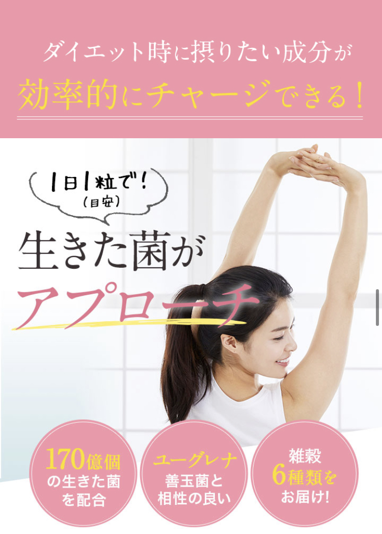 ポイント1:ユーグレナと相性のいいビフィズス菌B-3、酪酸菌、有胞子性乳酸菌、穀物麹をゴールデンバランスで配合。スッキリ理想のクビレボディへ近づけます。