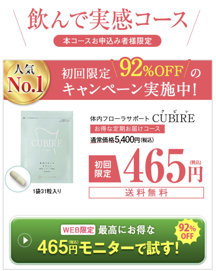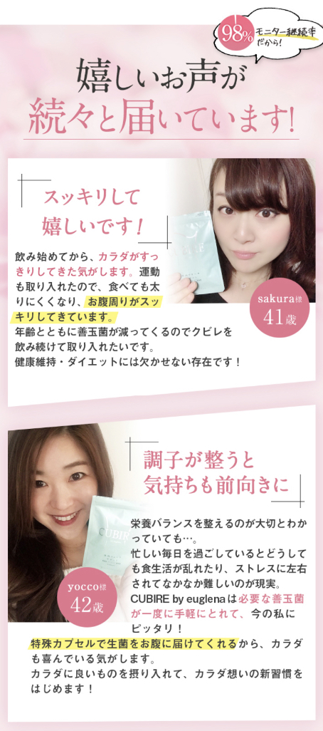 ヒントとなるのが、最近話題の「体内フローラ」。腸内に棲む細菌群です。腸内細菌には、善玉菌と悪玉菌があり、善玉菌が優勢になると余分な脂肪を溜め込むリスクは下がります。ダイエットには善玉菌を増やすことがとても重要。『CUBIRE』は善玉菌をとにかく増やす、体内フローラサプリの決定版です。