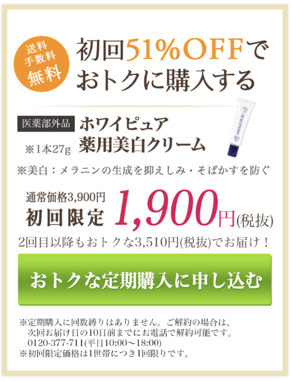 雑誌やメディアで取り上げられて今話題沸騰中の大人気【 ホワイピュア 薬用美白クリーム】がWEB限定でキャンペーンを実施中!