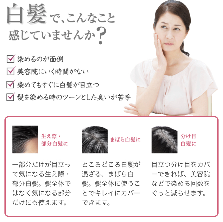 シャンプー後のトリートメントとして使うだけで髪表面を着色し、徐々に白髪を自然な色に仕上げます。