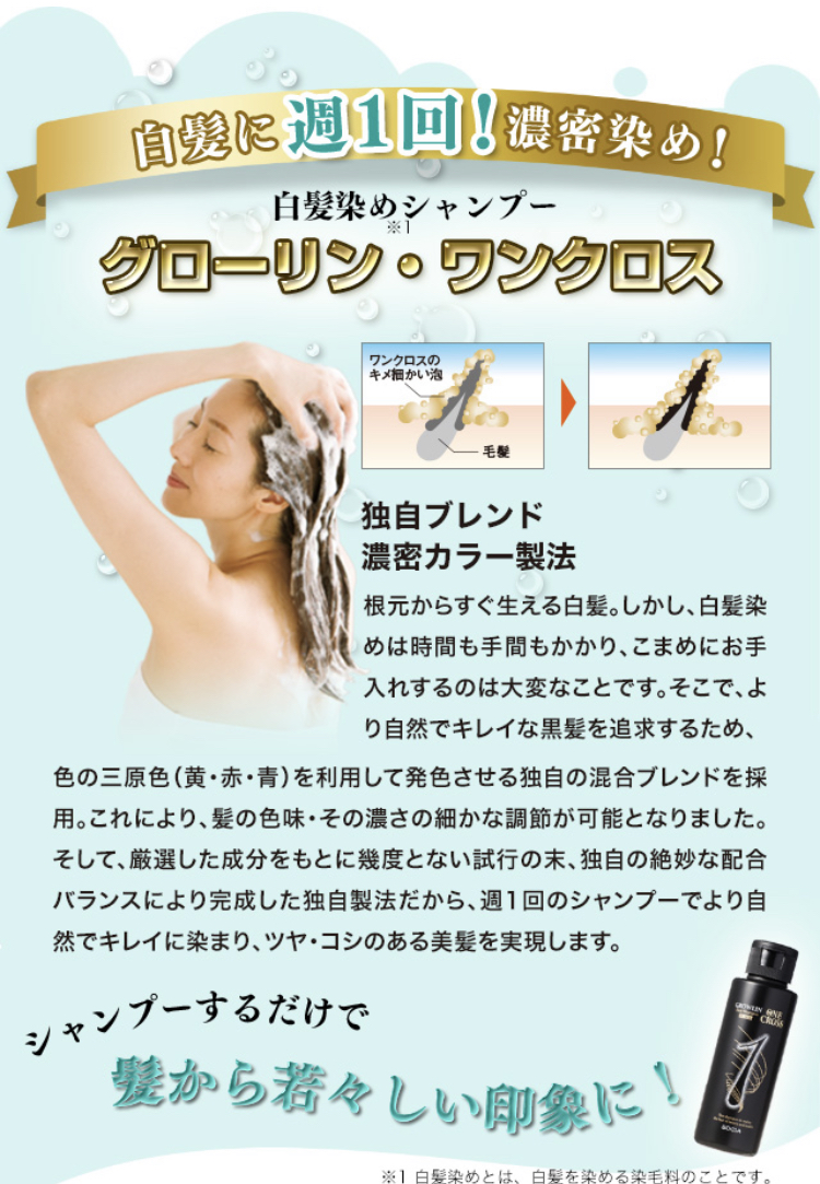 | ソシア 白髪に週1回でOKのシャンプー!濃密染め!【グローリン・ワンクロス】 |