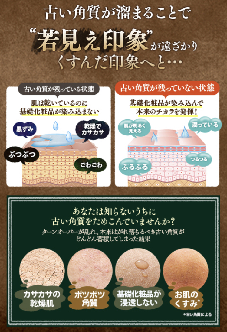 跡を残すことなく、「ポツポツがポロッ!」「ガサガサがつるん!」「明るくなった!」の感動体験。古い角質を取り除くことで、基礎化粧品も浸透しやすくなります |