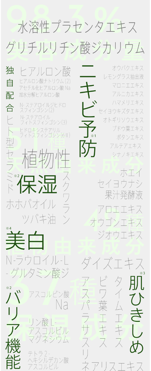 「プラセンタ」・・・活性酸素を除去する効果にすぐれ、ニキビケアだけでなくメラニンの生成を抑えシミ・そばかすを防ぎます。